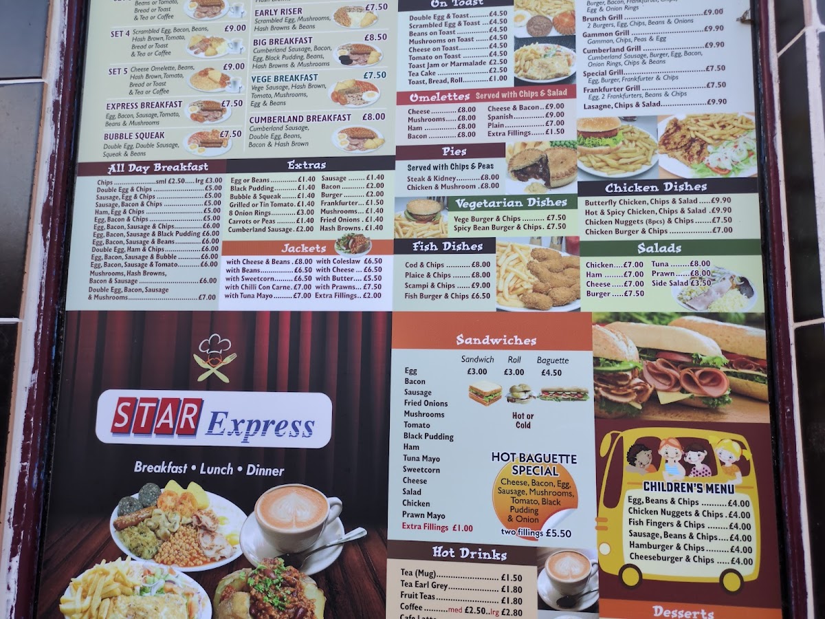 Located at 35 Leys Ave in Letchworth Garden City, Star Express Cafe offers an appealing selection that caters to all tastes. The menu shines with vegetarian delights such as the Vege Burger and the Spicy Bean Burger, both served with crispy chips for just £7.50. For those craving comfort food, their fish offerings, including Plaice & Chips and Scampi & Chips, are not to be missed.
